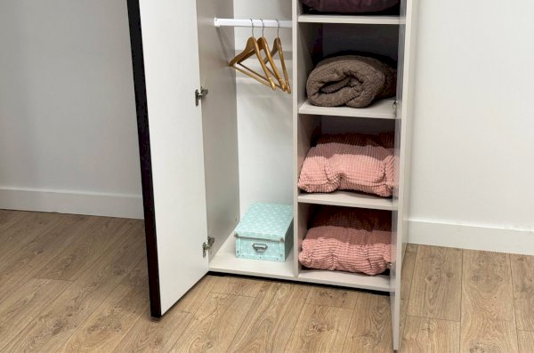 Шкаф оснащён длинными пластиковыми ручками и имеет удобное внутреннее наполнение: слева расположены полки, а справа — две штанги для вешалок. Это позволяет рационально использовать пространство и разместить различные типы одежды.