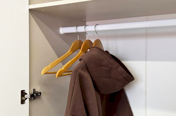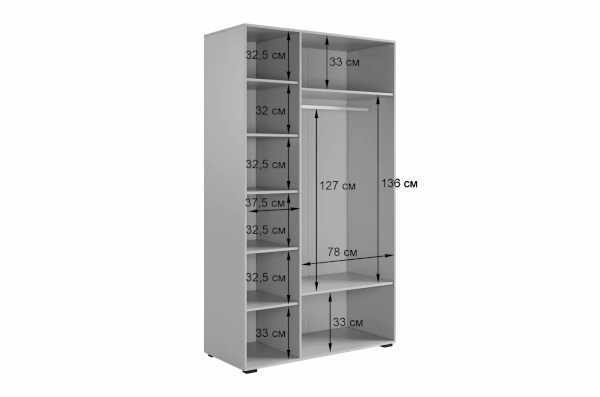 Шкаф имеет удобное наполнение: слева расположены полки для хранения вещей, а справа - штанга для вешалок. Это позволяет рационально использовать пространство и разместить различные типы одежды.