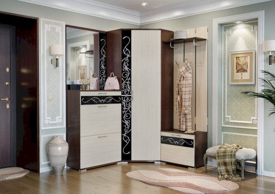 В тумбе 2 секции под обувь с полками, оборудованные газовыми кронштейнами и ящик на шариковых направляющих длиной 300 мм.