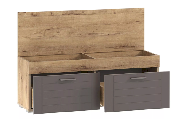 Тумбу Livorno НМ 040.72 можно использовать как обувницу и как банкетку одновременно. Модуль оборудован двумя выдвижными ящиками. В каждом из них можно разместить определенный вид обуви во избежание беспорядка при хранении. Под откидной крышкой тумбы находится небольшой отсек для средств по уходу за обувью, разделенный перегородкой на две равные части для удобства хранения. Мягкий элемент на крышке модуля превращает его в банкетку, на которой комфортно обуваться.