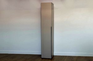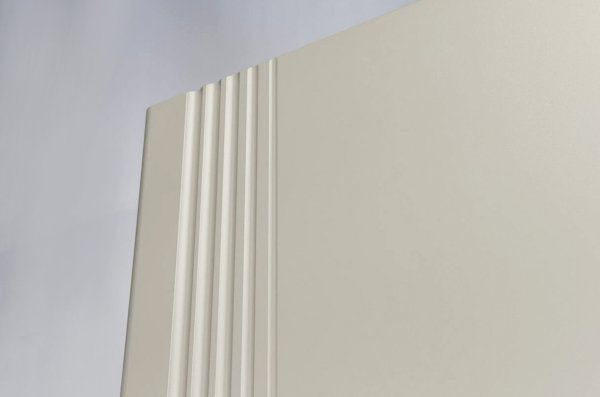 Особое внимание заслуживает фрезеровка фасада, которая придаёт шкафу изысканный вид. Длинная пластиковая ручка гармонично дополняет общий стиль.