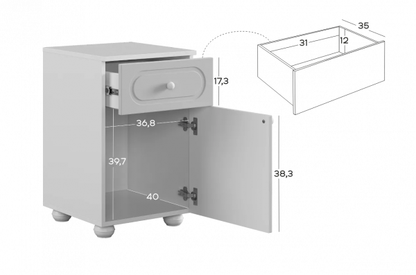 Модель оснащена выкатным ящиком на шариковых направляющих, обеспечивающих плавный и надёжный ход. В нижней части расположено отделение с распашной дверцей, которое подойдёт для хранения книг, игрушек, аксессуаров или текстиля.