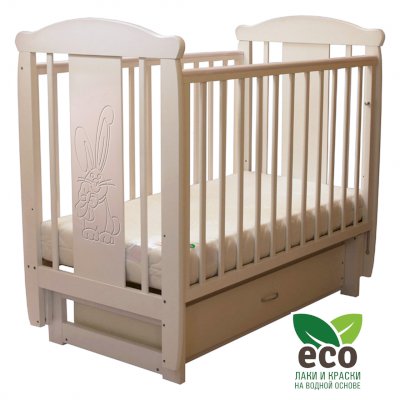 Кроватка декорирована фрезерным рисунком "Заяц с бантом". Уникальные фрезерные рисунки размером от 50 см на обеих спинках.