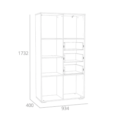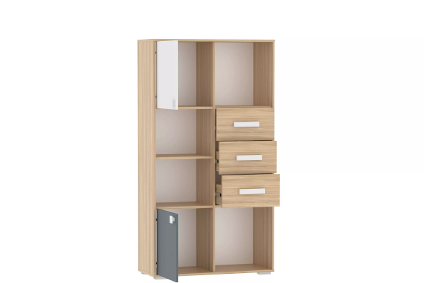 Стеллаж оснащен двумя полками с распашными дверками и тремя выдвижными ящиками, а открытые системы хранения позволяют расставить на видных местах сувениры, книги и украсить комнату так, как нравится ребенку. Для выдвижения ящиков используются шариковые направляющие, которые равномерно распределяют вес содержимого и обеспечивают плавный бесшумный ход ящика. Двери могут крепиться как на левую, так и на правую стенки.