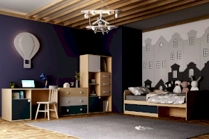 Стеллаж из новой коллекции детской мебели Элиот выполнен в нейтральных оттенках песочного, белого и контрастного маренго – цвета темной морской волны, что позволяет вписать стеллаж в интерьер спальни как девочки, так и мальчика, придав комнате современный и стильный вид.